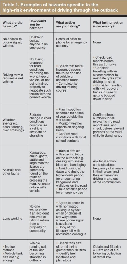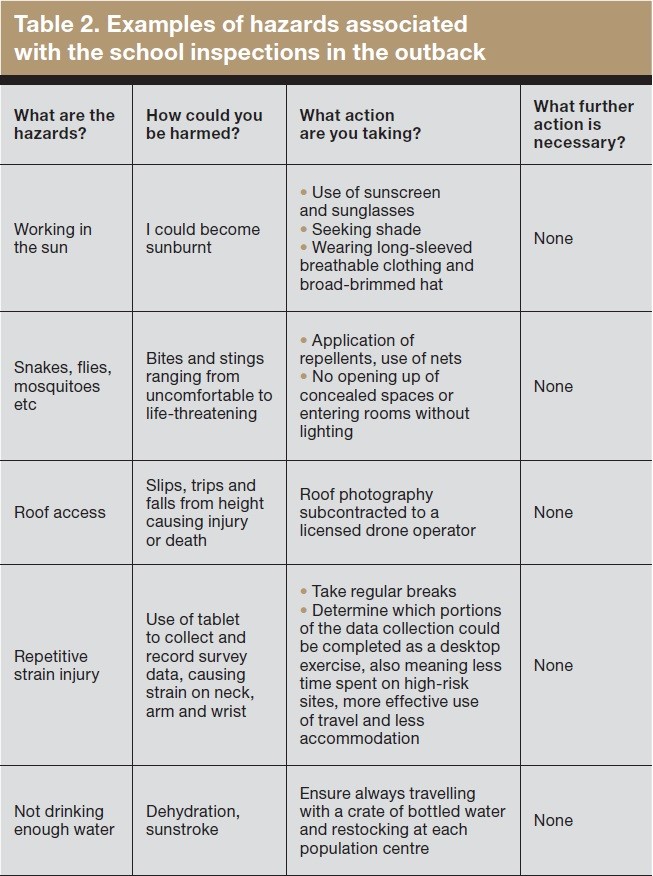 Once we had determined that the inspection schedule could not be fulfilled by flying to each location, a driving route was established and journey times estimated. With my itinerary to hand, a risk management exercise could be performed by considering how my plan of action might deviate from expectations. Table 1 provides information on hazards specific to the high-risk environment of driving through the outback, while hazards associated with the inspections themselves are detailed in Table 2.