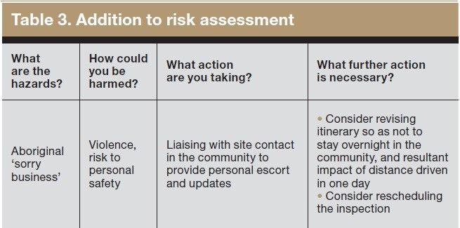 While I was confirming access arrangements to a remote Aboriginal community school, the principal advised me that the community was observing sorry business, and I therefore had to update my risk assessment (see Table 3).